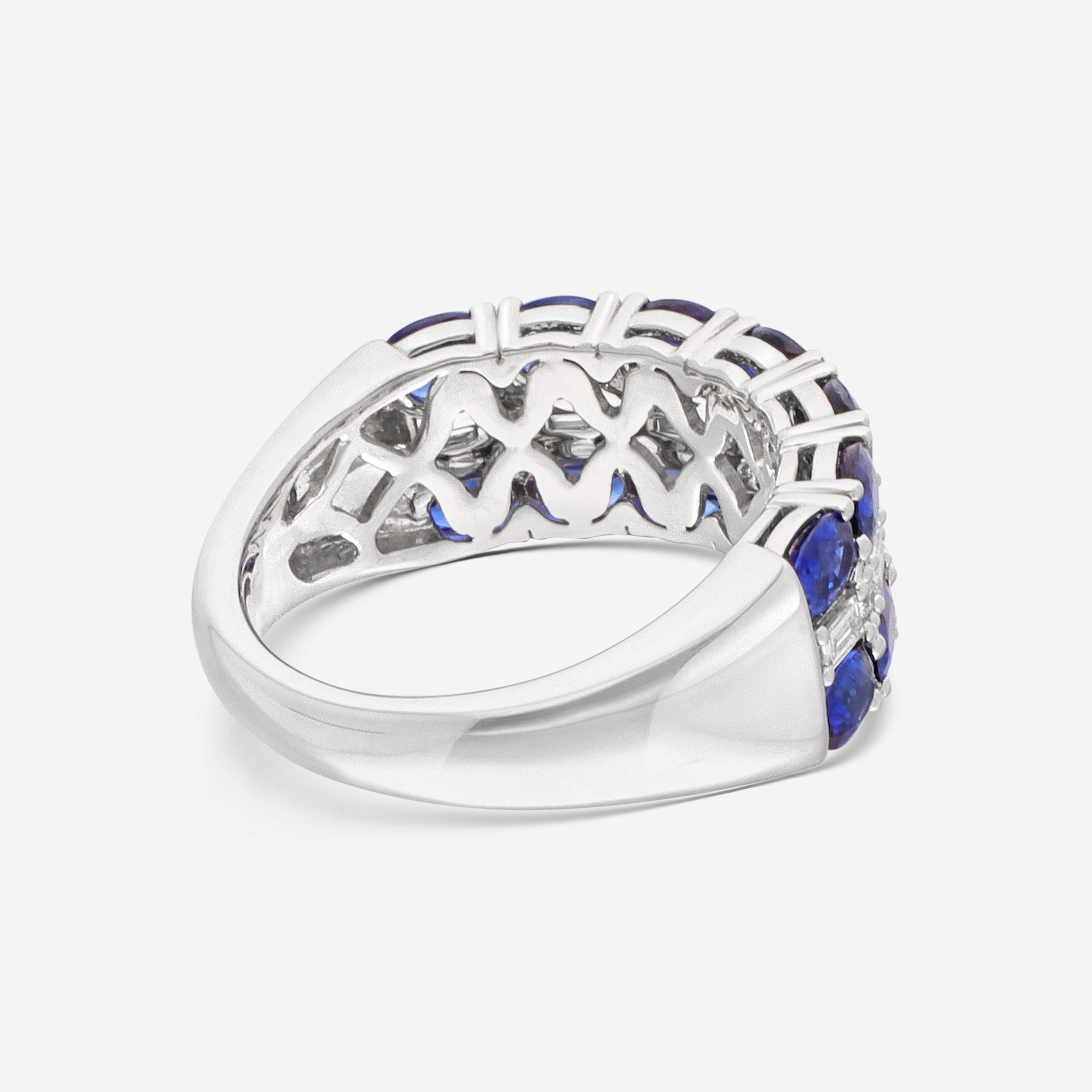 This statement ring by Ina Mar is crafted in luxurious 14K white gold, featuring a bold and distinctive design adorned with three rows of diamonds and blue sapphires. The total diamond weight is 0.31 carats, providing a brilliant and captivating sparkle, while the blue sapphires contribute a rich and vibrant touch of color with a total weight of 3.17 carats.