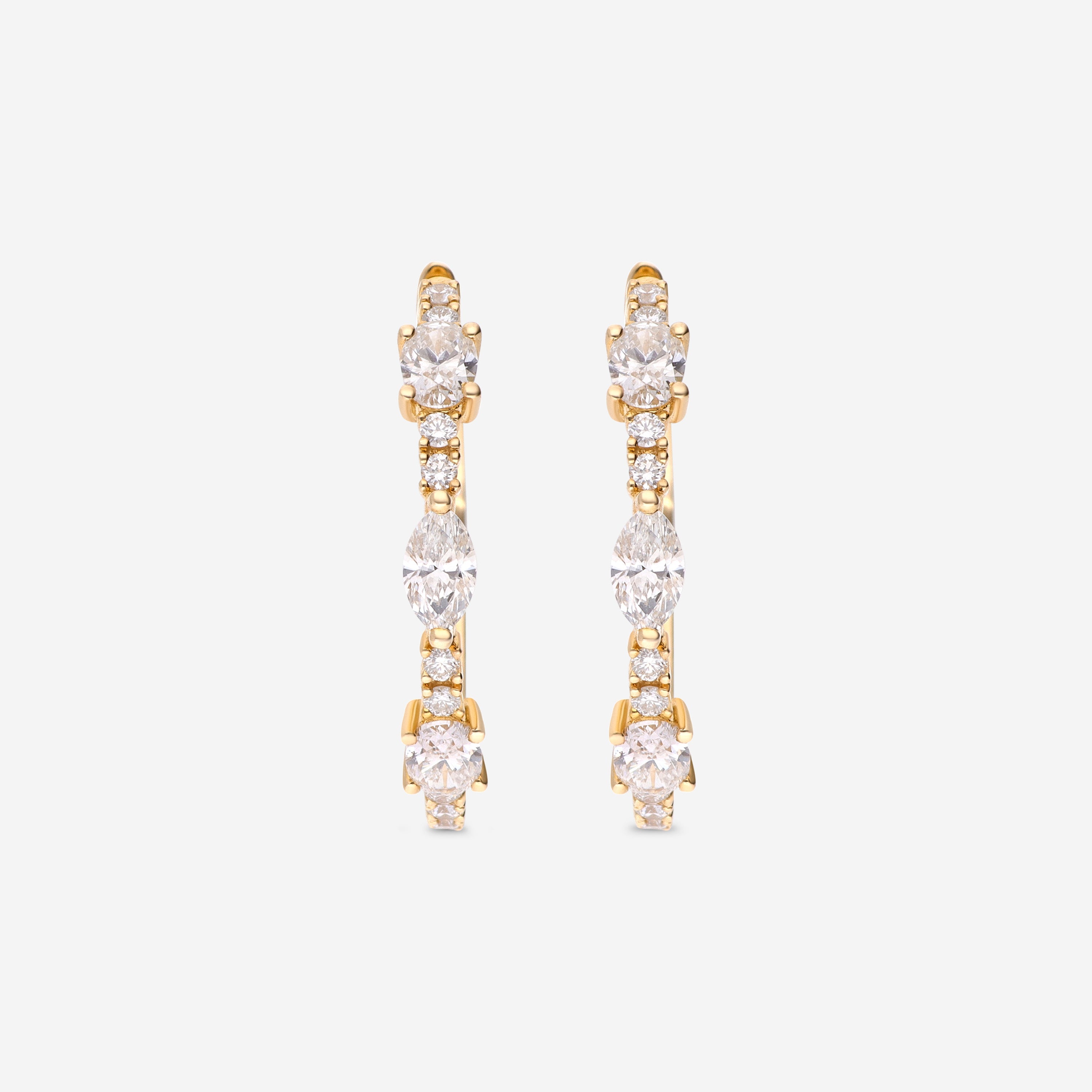 These hoop earrings by Ina Mar are crafted in radiant 14K yellow gold, featuring a captivating design adorned with both round and oval-shaped diamonds. The total diamond weight is 1.69 carats, providing a brilliant and captivating sparkle. Hoop earrings are a classic and versatile style, and the combination of different diamond shapes adds a unique and sophisticated touch to the design.