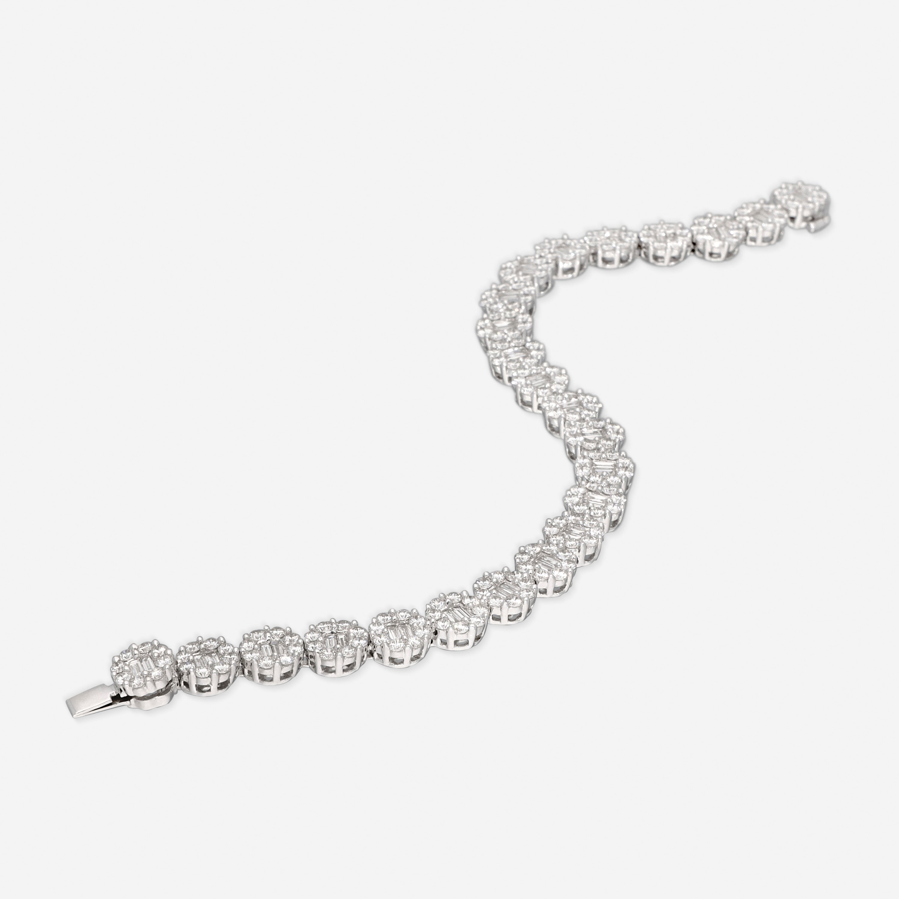 This bracelet by Ina Mar is crafted in luxurious 18K white gold, featuring a design adorned with diamonds. The total diamond weight is an impressive 7.68 carats, creating a bracelet that exudes brilliance and sophistication. The diamonds are likely to be meticulously set, showcasing their sparkle and creating a piece that makes a statement.