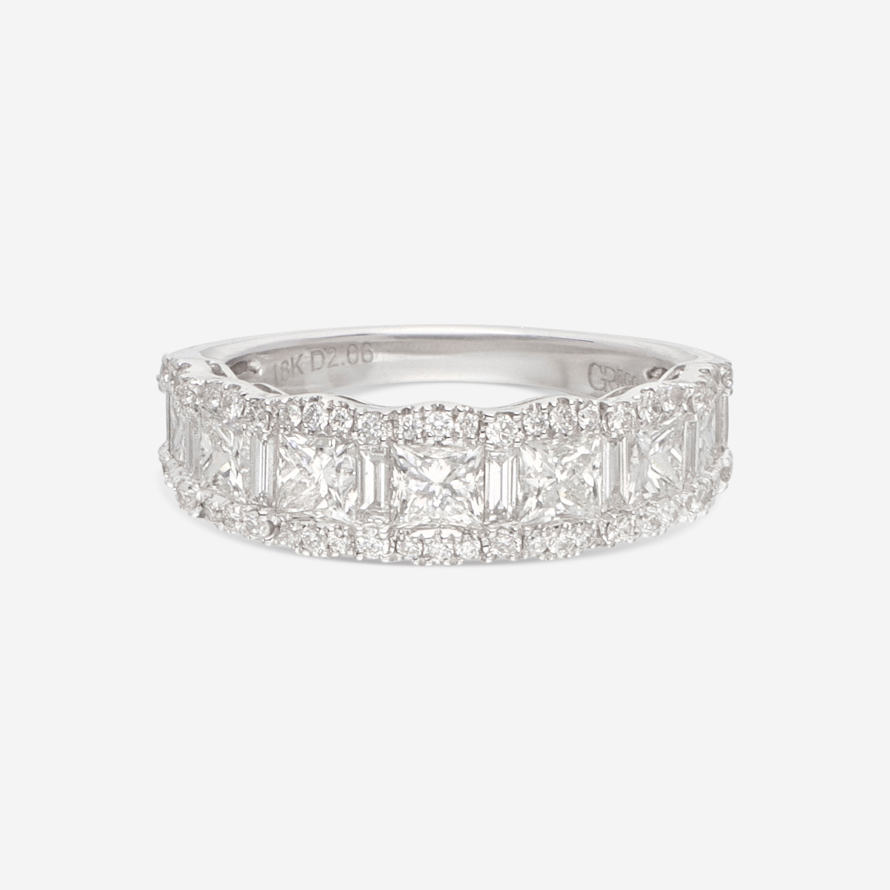 This statement band ring by Ina Mar is crafted in luxurious 18K white gold, featuring a bold and distinctive design adorned with diamonds. The total diamond weight is 2.06 carats, providing a brilliant and captivating sparkle that makes a statement.